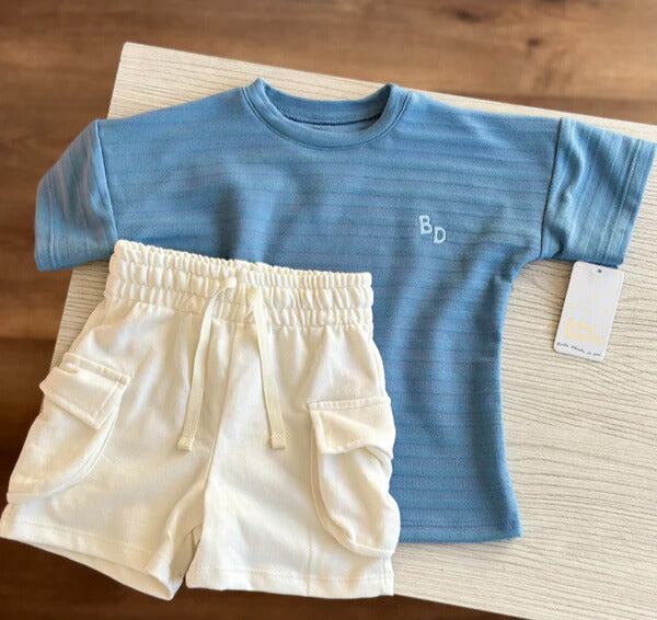 The Baby Dante Blue set is a stylish and comfortable outfit for baby boys, perfect for both special occasions and daily wear with a touch of distinction. Designed in a soft combination of blue and white tones, this coordinated set adds a classic yet modern touch to your little one's wardrobe. The oversized blue shirt offers a relaxed and contemporary look, while the white pants complement the ensemble with freshness and elegance. Crafted from lightweight and breathable fabric, your baby will look adorable and stay comfortable throughout the day.