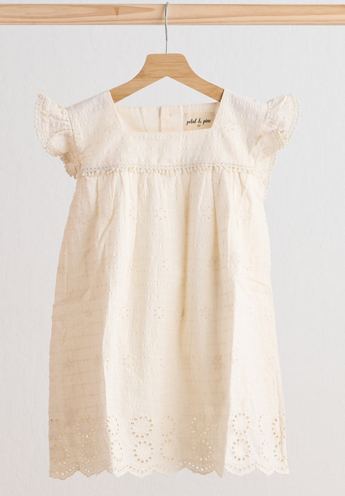 Flutter into style with this adorable white lace dress for girls! The flutter sleeves add a touch of whimsy and the lace detailing makes it perfect for any occasion. She'll look oh-so-sweet in this dress!